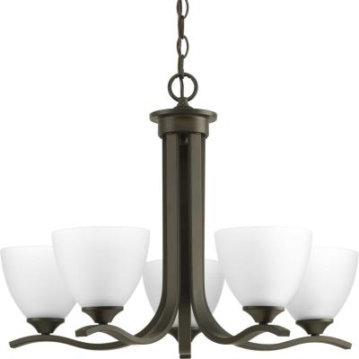 The Laird collection provides a contemporary complement to casual interiors popular in today’s homes. Glass shades add distinction and provide pleasing illumination to any room, while scrolling arms create an airy effect. Five-light chandelier in an Antique Bronze finish.